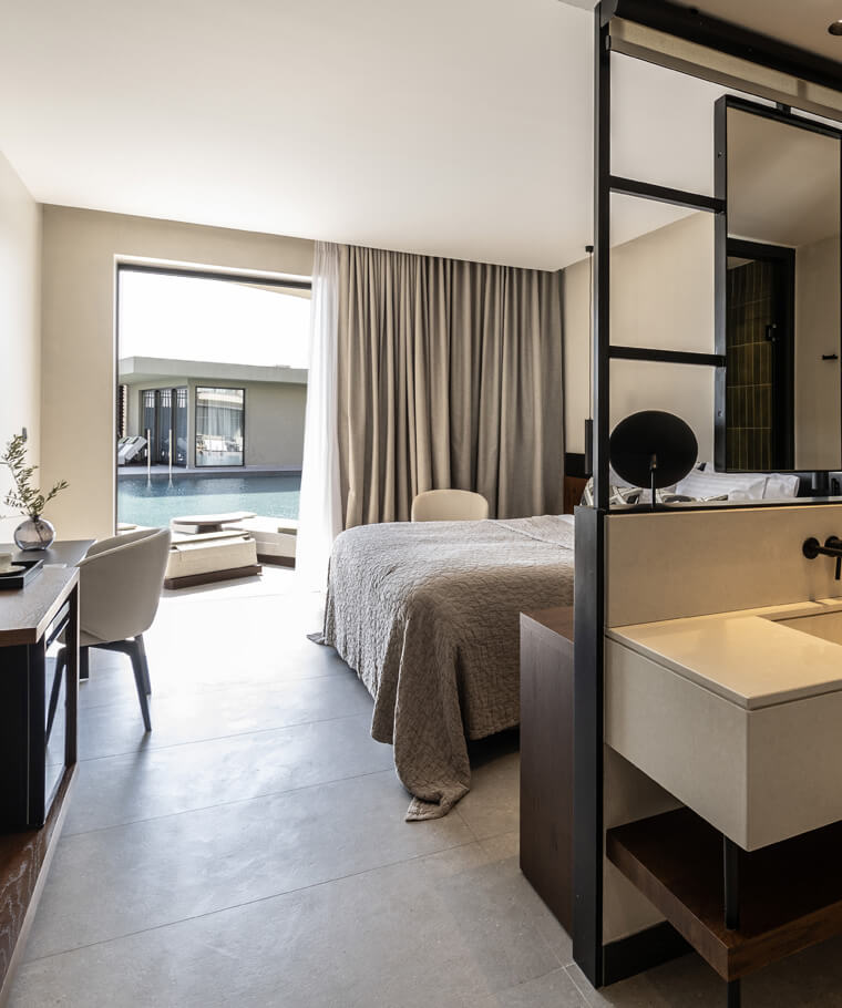 Großzügige Innenräume, perfekt abgestimmt auf pure Entspannung – mit extra-komfortablen Betten und hochwertiger Bettwäsche. Erleben Sie das Gefühl, auf dem Wasser zu schweben, mit direktem Zugang zum Hauptpool und einer unmittelbaren Verbindung zum Element Wasser.